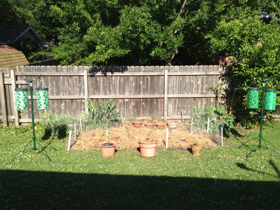 One of the cherry tomato plants (the one on the far right) has apparently died, but the others have produced quite a few healthy tomatoes. The celebrity tomato plant has one or two growing. The cayenne plant has produced several healthy peppers, and the crazy-hot-insanity pepper is doing well. The cantaloupe have several flowers, and two of the four broccoli plants are doing well. (The other two were eaten by something, probably rabbits, after I mowed the back yard and got rid of all the fresh clover we had back there.)